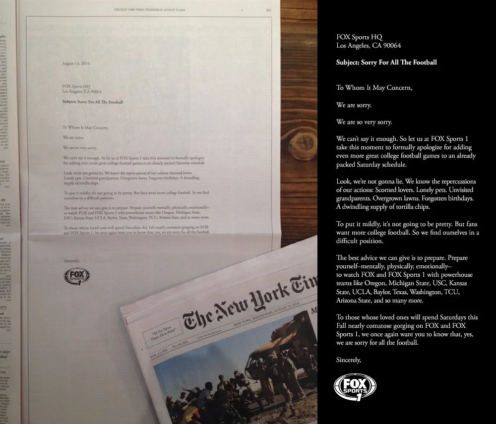 Social, print and, that’s right, an apology letter in the New York Times newspaper because guess what, Fox Sports viewers read the NYTimes!