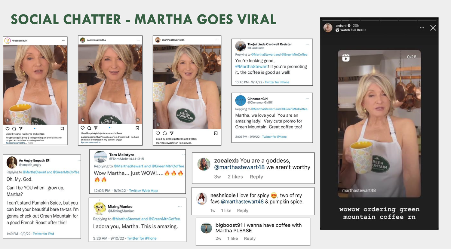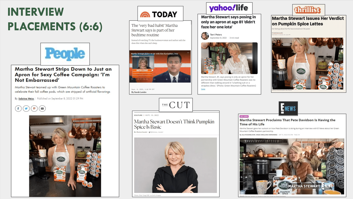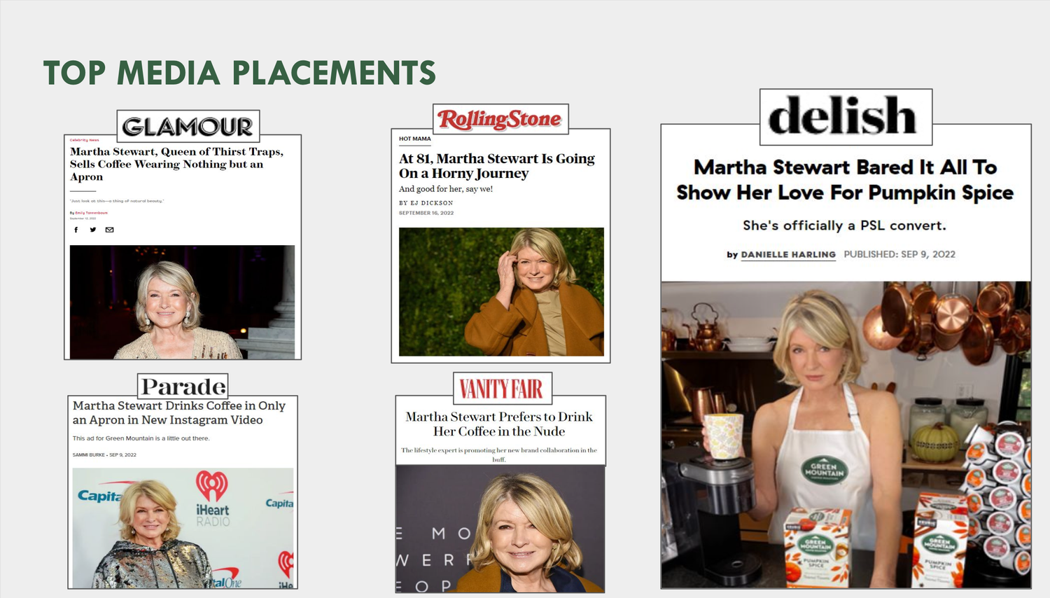 A project of a lifetime! And award winning as well. We shot and launched a social video with the legendary Martha Stewart where she is wearing nothing but an apron. Why? Because the coffee she is drinking Green Mountain Coffee Roasters striped away all the artificial flavors, leaving nothing but the goodness. So we did the same, or at least Martha did.