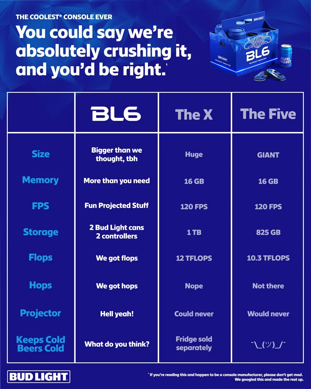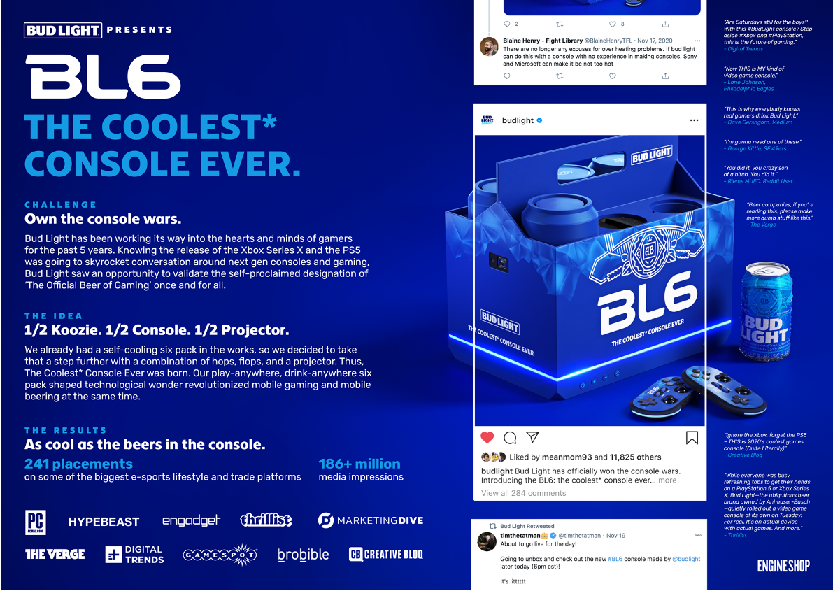 As the next-gen console war was heating up, Bud Light wanted to step in and cool things off. So with the help of a few visionaries (and a couple of beers), ENGINE SHOP developed the coolest console ever: the BL6. This self-cooling 6-pack-inspired system was ½ koozie, ½ console and ½ projector. It revolutionized the way gamers game and beer.
